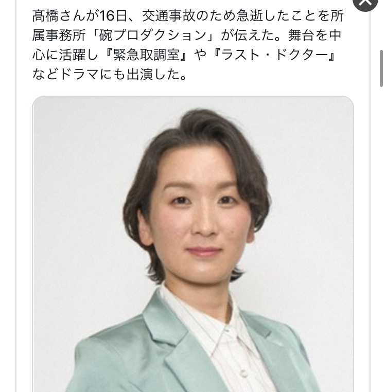 【訃報】女優・髙橋智子さん(39)交通事故で急逝 舞台やドラマ『緊急取調室』『ラスト・ドクター』などで活躍
