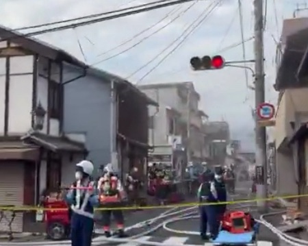 現地の画像では、古い町家が立ち並ぶ通りに煙が立ちこめ、消防隊員が消火活動にあたる様子が写っている。