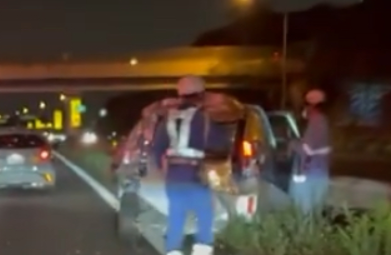 • 車両が路肩に寄せられ、作業員(警察官または道路管理者)が対応にあたっている。