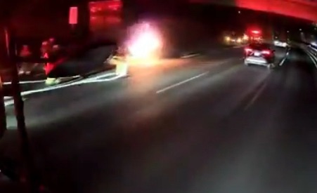 ドライブレコーダーの映像からも、走行車線脇で車両が激しく炎上している様子が確認でき、火勢は強く、走行車線にも光が反射している状況でした。