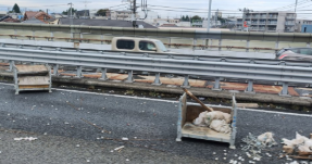 - 追突事故の可能性があり、これによりパレットに積載されていたとみられる荷物が路上に大量に散乱し、道路を塞いでいる状況です。