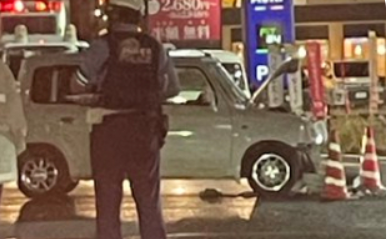 現場の画像では、交差点付近で車両が停車し、車体前面に損傷が見られます。交通整理の担当者や警察官(または消防・交通整理員)が複数名、対応にあたっている様子が確認されました。