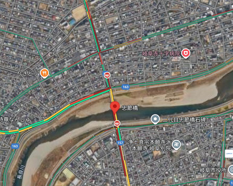 2025年10月28日(火)午前、岐阜県岐阜市東島にある**忠節橋(ちゅうせつばし)**付近で交通事故が発生し、周辺の道路で大きな交通規制と渋滞が発生しています。通勤・通学時間帯に重なり、現地では混乱が生じています。