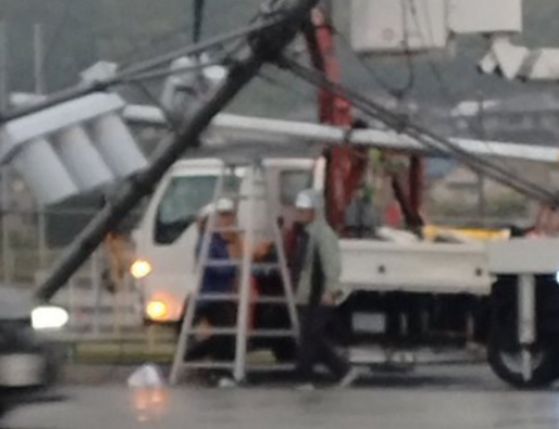 - 被害状況: 交通事故により電柱と信号機が完全に折れ曲がり倒壊。