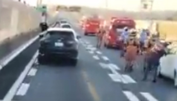 画像には、数台の車両が車線を塞ぐ形で停止し、後方には複数の救急・パトロール車両、そして多数の作業員が集まっている緊迫した様子が写っています。周辺は完全に渋滞し、交通がストップしている状態です。
