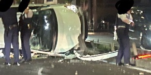 現場の画像では、白っぽい乗用車が道路の片側で大きく横転しており、周囲には破片などが散乱している様子がうかがえます。