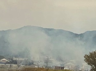 - **目撃情報:** 現場の近くは田畑や住宅地が混在するエリアで、写真からは煙が広範囲に及んでいることが確認できます。