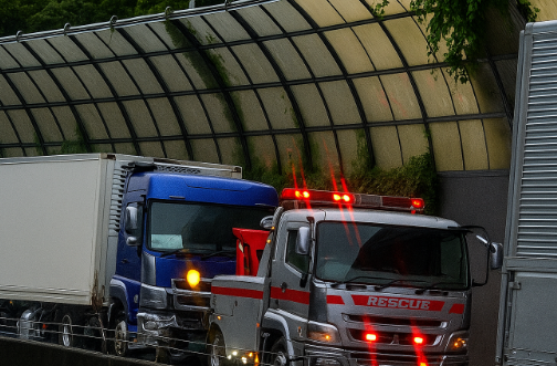 | 現場状況 | 画像には、大型の箱型トラックと、緊急車両(レスキュー・特殊車両)が写り込んでおり、大規模な事故処理が進行中と見られます。 |