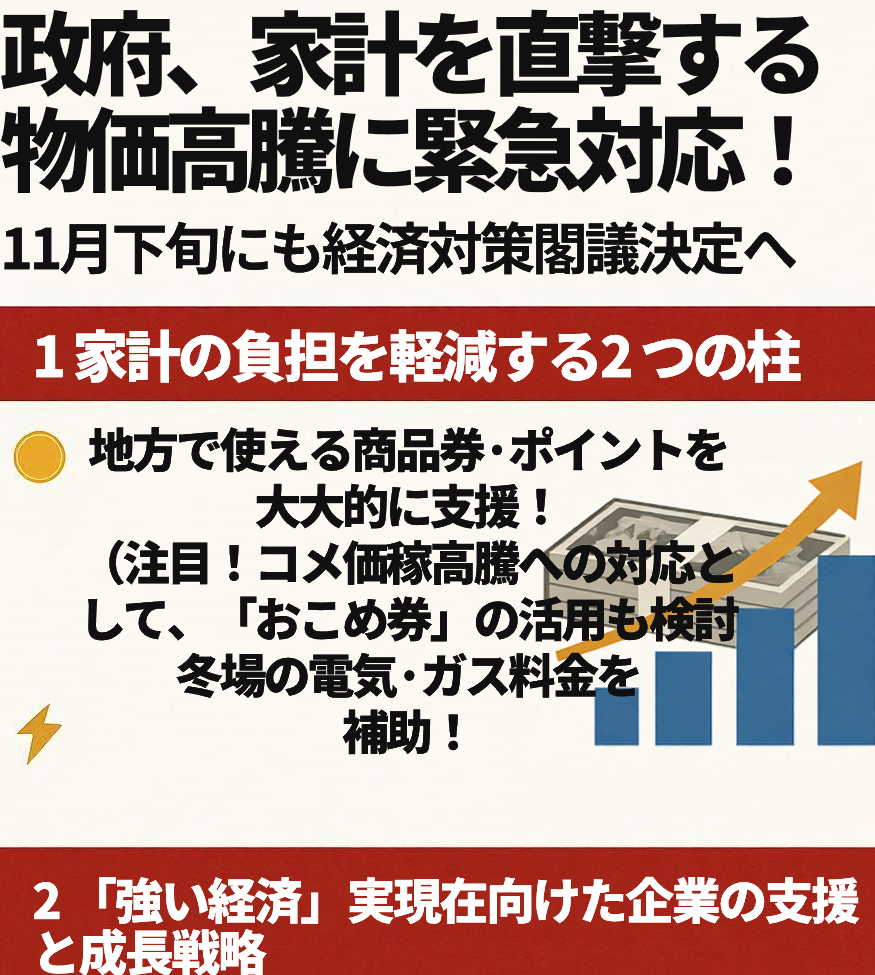 • 【注目!】 コメ価格高騰への対応として、「おこめ券」の活用も検討されており、食料品価格高騰の家計負担を和らげる狙いです。