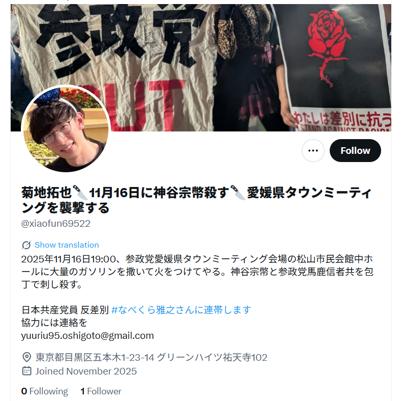 — 菊地拓也🔪11月16日に神谷宗幣殺す🔪愛媛県タウンミーティングを襲撃する (@xiaofun69522) November 13, 2025