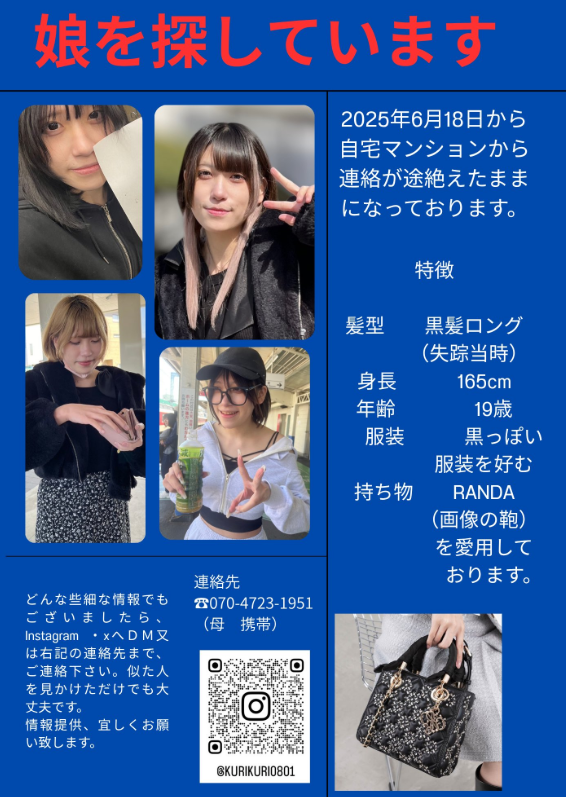 2025年6月18日以降、大阪府東大阪市に住む19歳の女性が行方不明となっていることが分かった。家族によると、当日を最後に自宅マンションから連絡が取れなくなり、現在も消息がつかめない状況が続いている。家族は警察へ届け出を行い、SNSなどを通じて広く情報提供を呼びかけている。