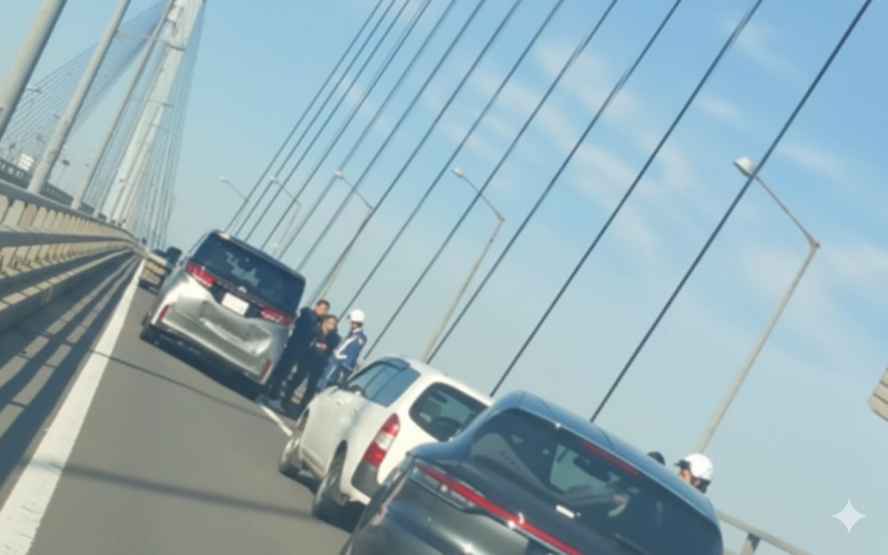 橋の上で車両が列をなし、ドライバーが車外に出て安全確認をする様子も撮影されています。