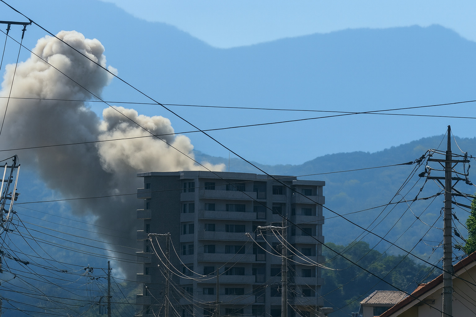 投稿された写真では、建物の間からもうもうと上がる煙柱が視認でき、周囲には電線・建物が密集している市街地であることから、延焼への懸念も出ています。