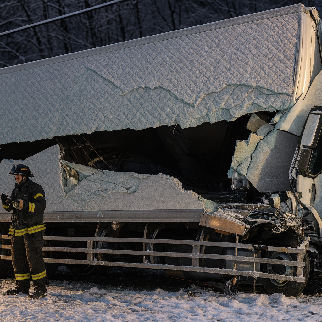 - 状況: 大型トラックのキャビン(運転席)部分が激しく損傷するほどの大破事故。