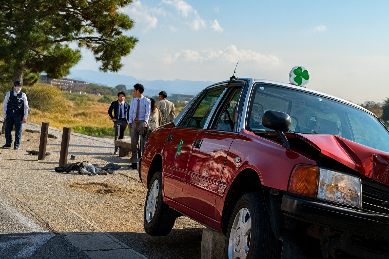 画像からは、エンジ色の車体に「三つ葉のクローバー」のマークでおなじみのヤサカタクシーと思われる車両が、歩道の縁石を乗り越え、川沿いの土手の方へ車体を乗り上げている様子が確認できます。 ボンネットの左前方が大きくひしゃげており、衝突の激しさを物語っています。