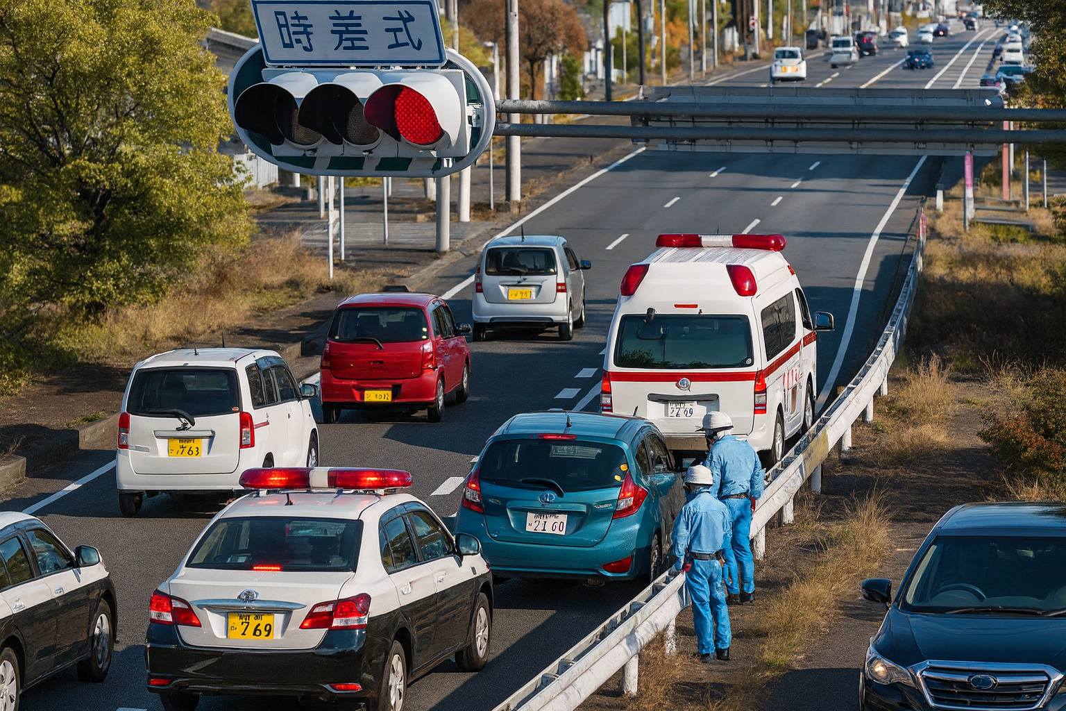 事故現場付近では、緊急車両の出入りや現場検証が行われています。脇見運転による追突(二次災害)を防ぐため、車間距離を十分にとって慎重に通過してください。