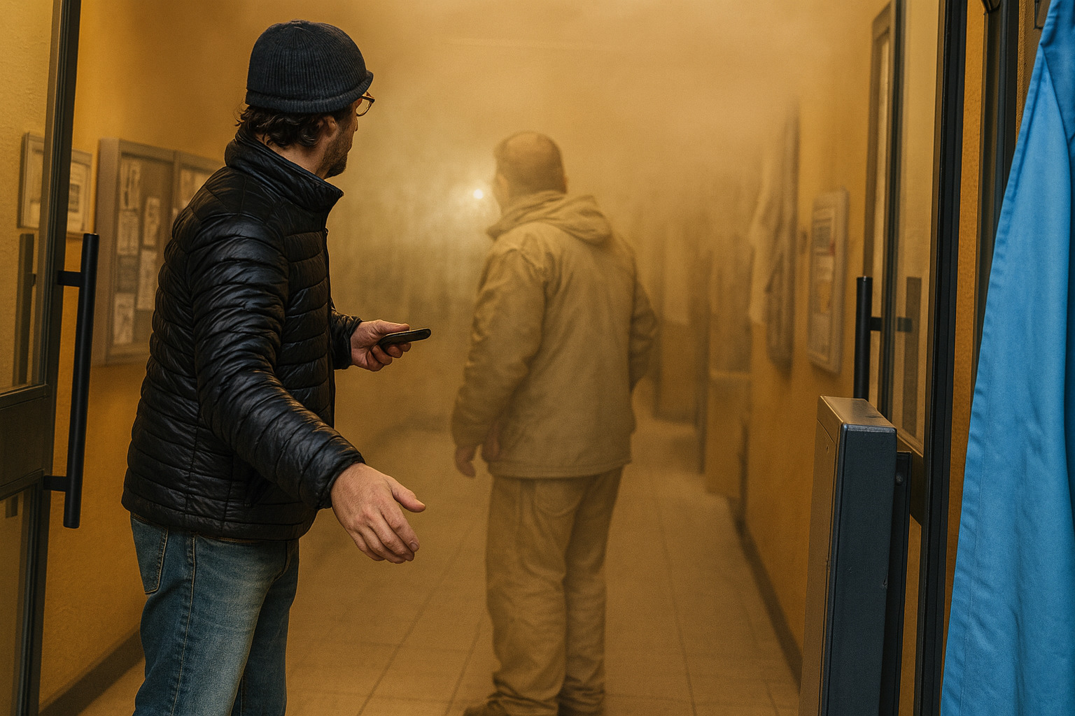 公開された画像からは、黄色味がかった煙が建物内を漂っており、消防隊員と思われる人物や関係者が状況を確認している緊迫した様子がうかがえます。