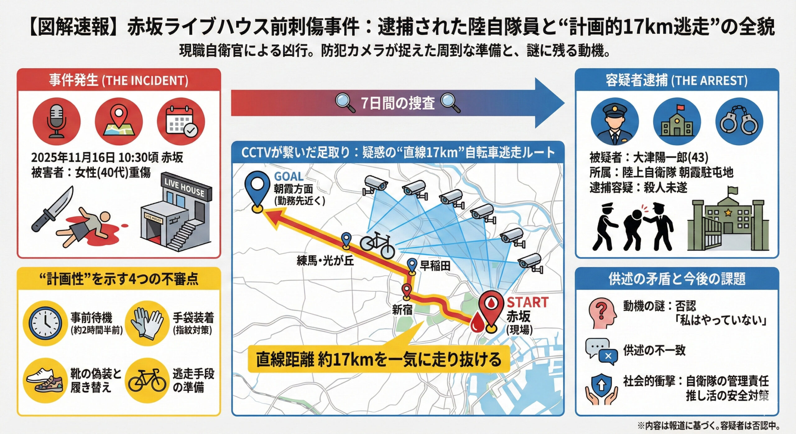 【速報解説】東京・赤坂ライブハウス前刺傷事件 逃走していた陸上自衛官・大津陽一郎(43)容疑者が殺人未遂容疑で逮捕 ― 防犯カメラが追跡した“17km逃走ルート”とは