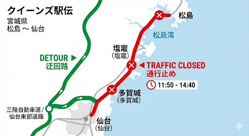 これに伴い、コースとなる宮城県松島町から仙台市にかけての「国道45号線」および周辺道路では、昼頃から車両の通行止めを含む大規模な交通規制が実施されます。