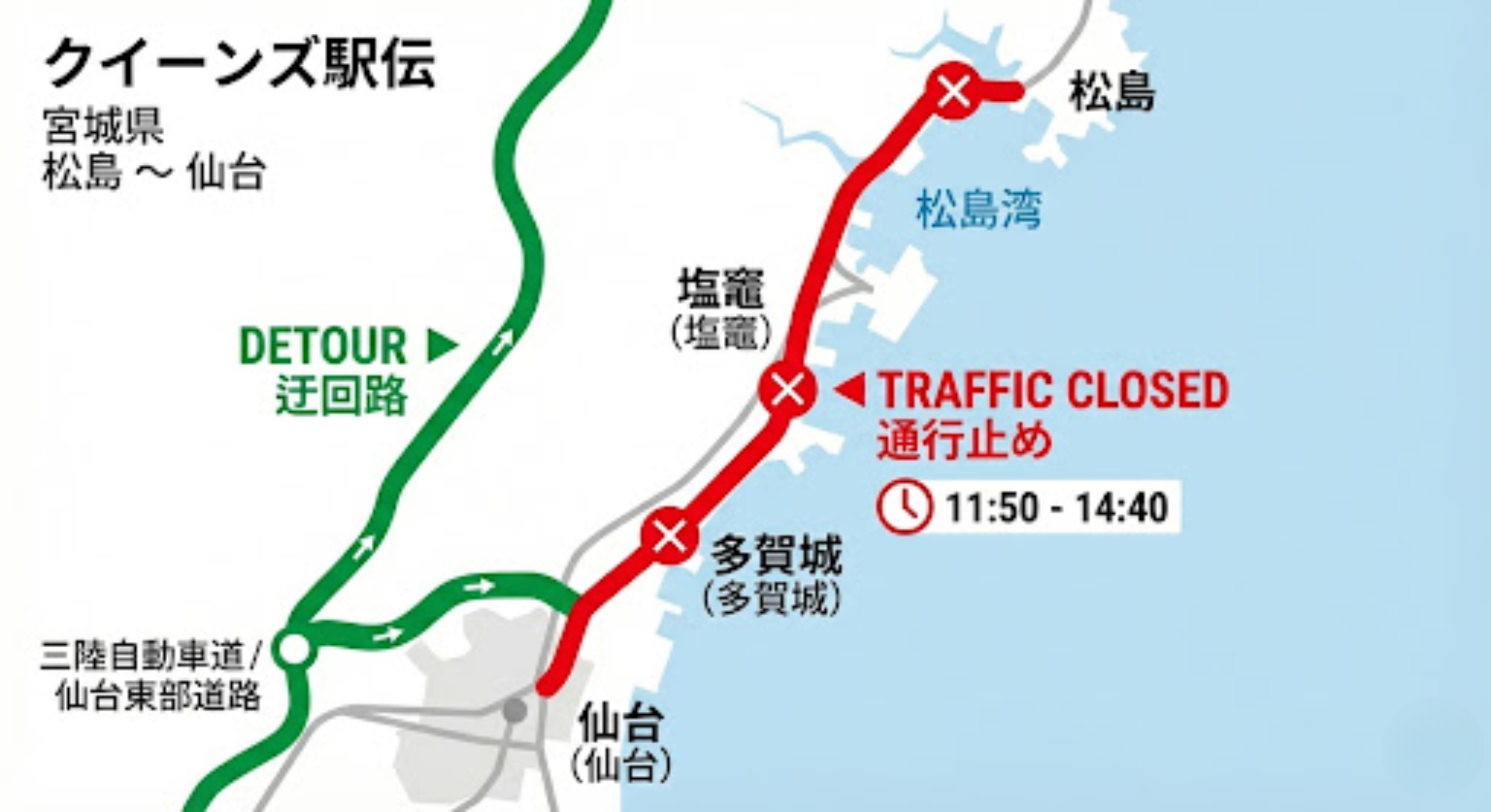 【2025】宮城県クイーンズ駅伝の交通規制・通行止め時間は?国道45号の迂回路・『松島町、多賀城、塩竈市、仙台市』 渋滞情報を徹底解説