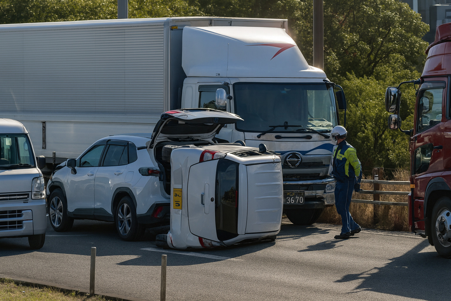 • 消防や警察が駆けつけ、救助活動と交通整理が行われている。