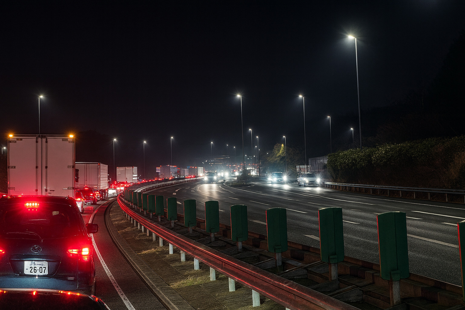 投稿された画像からは、夜間のため視界が悪く、多くのトラックや乗用車のテールランプが連なっている様子が確認できます。物流のトラックなども多く巻き込まれており、完全にストップしている時間帯もある模様です。