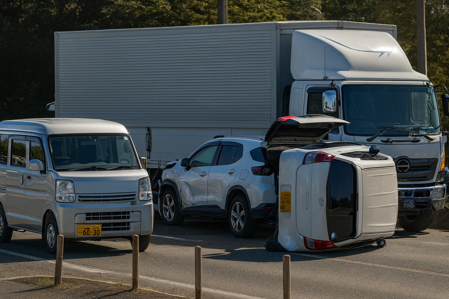 SNS上の目撃情報や現場の画像によると、軽自動車(アルト等)を含む少なくとも2台の車両が道路上で横転しており、衝撃の大きさを物語っています。トラックのほか複数の車両が大破しており、救助活動と現場検証が行われています。
