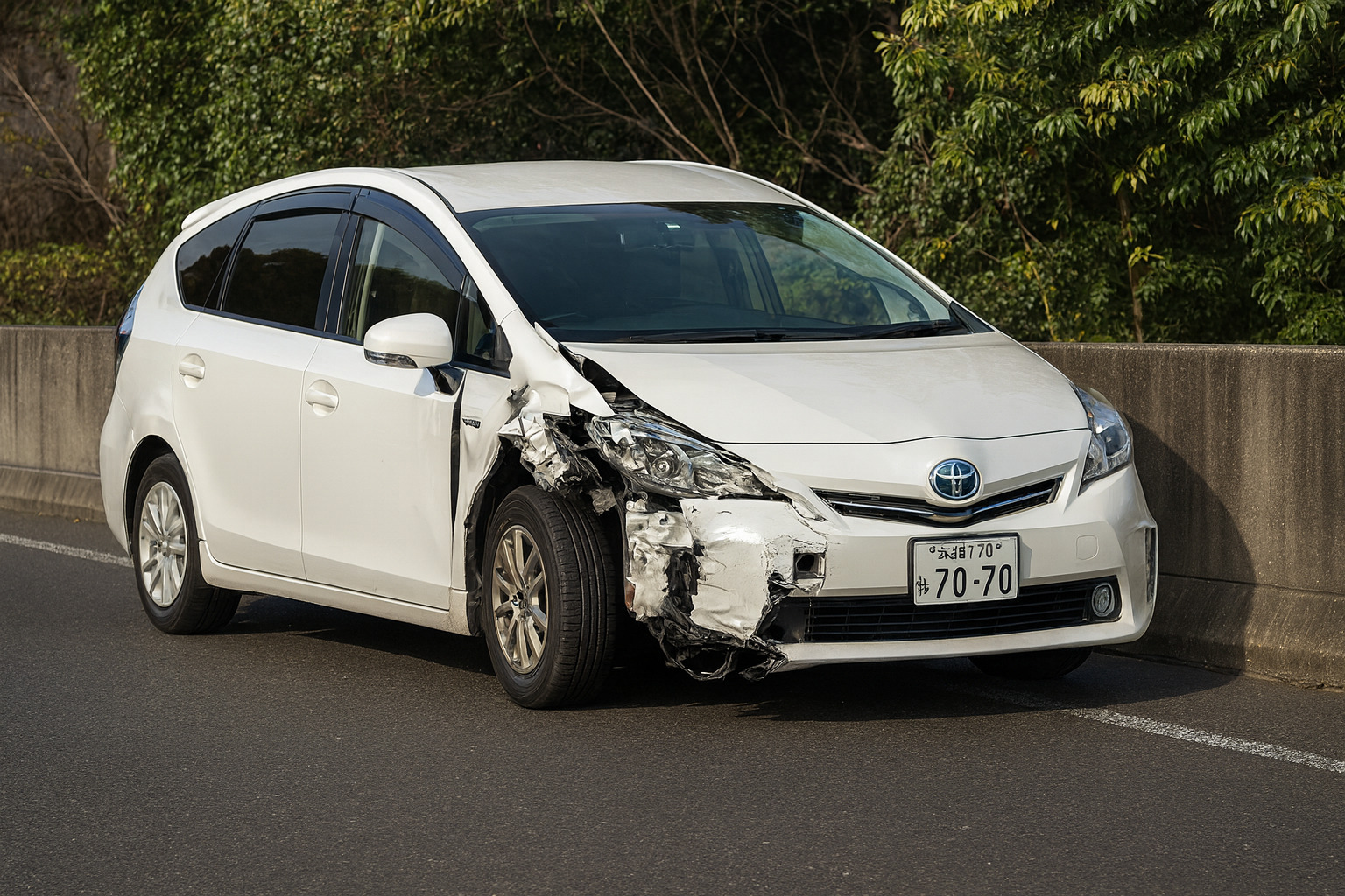 - 被害状況:白い乗用車の右前方が大破し、路肩の壁に接触して停車