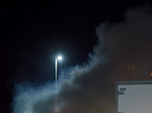 夜間のため視界が悪い中ですが、赤色灯と煙が立ち込め、騒然とした雰囲気になっていることが伺えます。