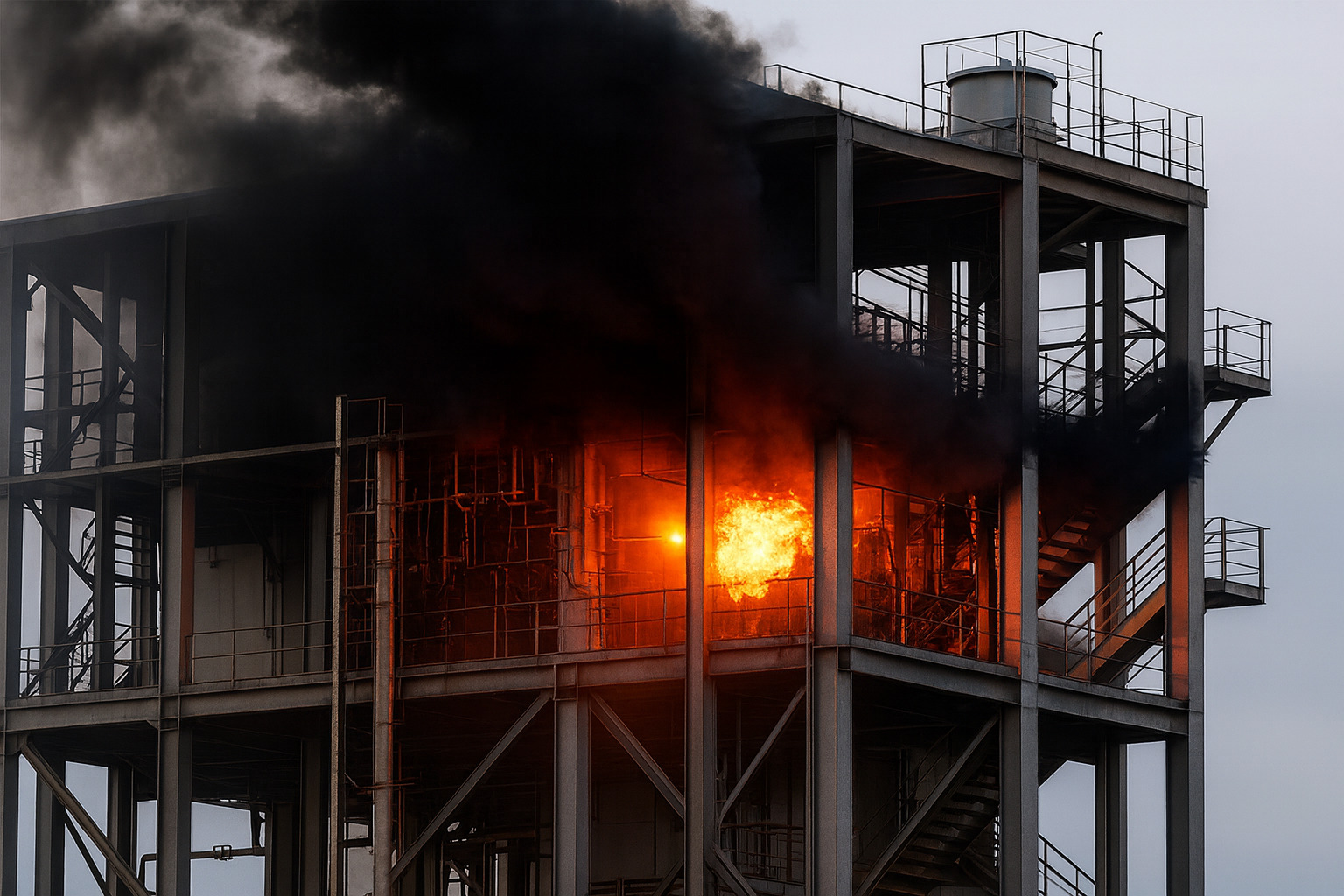 SNS上の投稿画像では、プラントのような施設内で赤黒い炎が激しく燃え上がっている様子が確認できます。