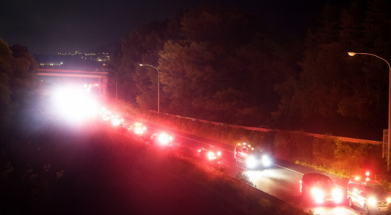公開された道路情報板およびライブカメラの映像では、現場付近で赤色の回転灯(パトランプ)や照明弾のような強い光が確認でき、緊急車両による対応が続いている様子が伺えます。