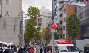 公開された画像からは、築地警察署前の通りに救急車が停車し、警察官や関係者が周囲を取り囲んでいる緊迫した様子が確認できます。「自転車を除く」という標識の下、多くの人々が心配そうに見守る中での搬送となりました。