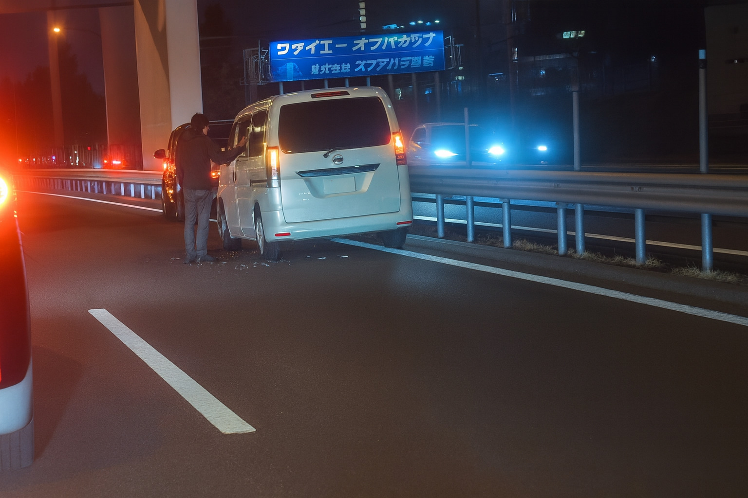 - 白いミニバンタイプの車両が中央分離帯(ガードレール)付近に停車している。