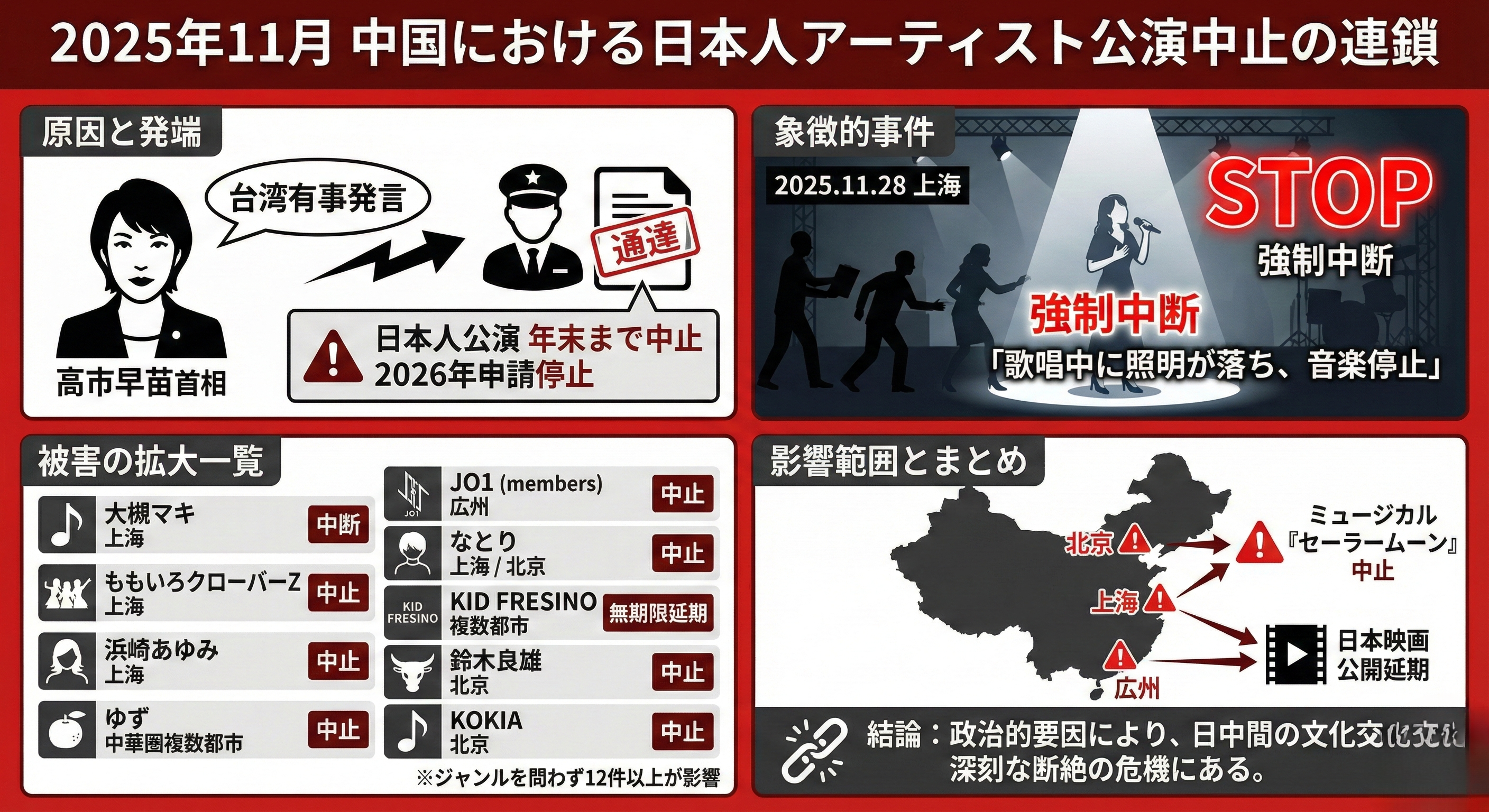 2025年11月現在、中国で開催予定だった日本人アーティストによるライブやイベントが相次いで中止となる異常事態が発生しています。