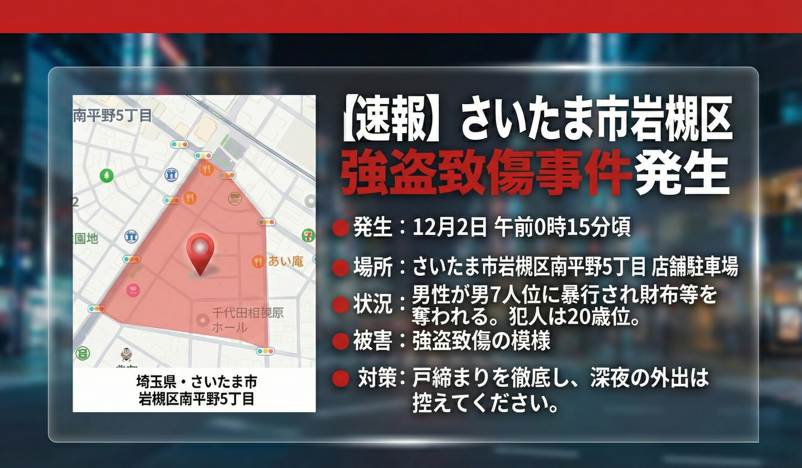 2025年12月2日(火)未明、さいたま市岩槻区南平野5丁目の店舗駐車場にて、男性が集団に襲われる強盗致傷事件が発生しました。