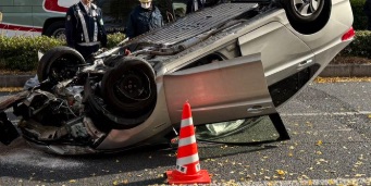 • 車両の状態:シルバーの乗用車が完全に逆さまになり、屋根が路面に接する状態で横転。車体は大きく破損(大破)しています。