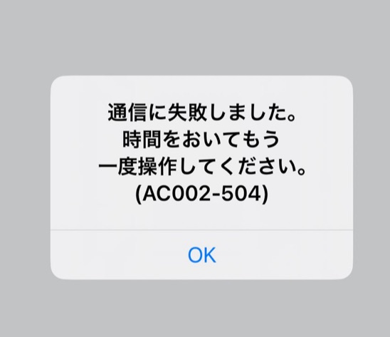 表示されているエラーコード「AC002-504」は、一般的にサーバーとの通信確立に失敗した際に表示されるものです。