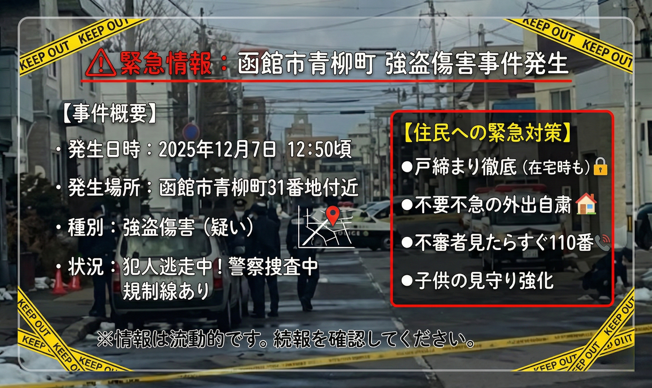 犯人が逃走している可能性があります。函館市青柳町、谷地頭町、宝来町および周辺エリアにお住まいの方は、以下の対策を徹底してください。
