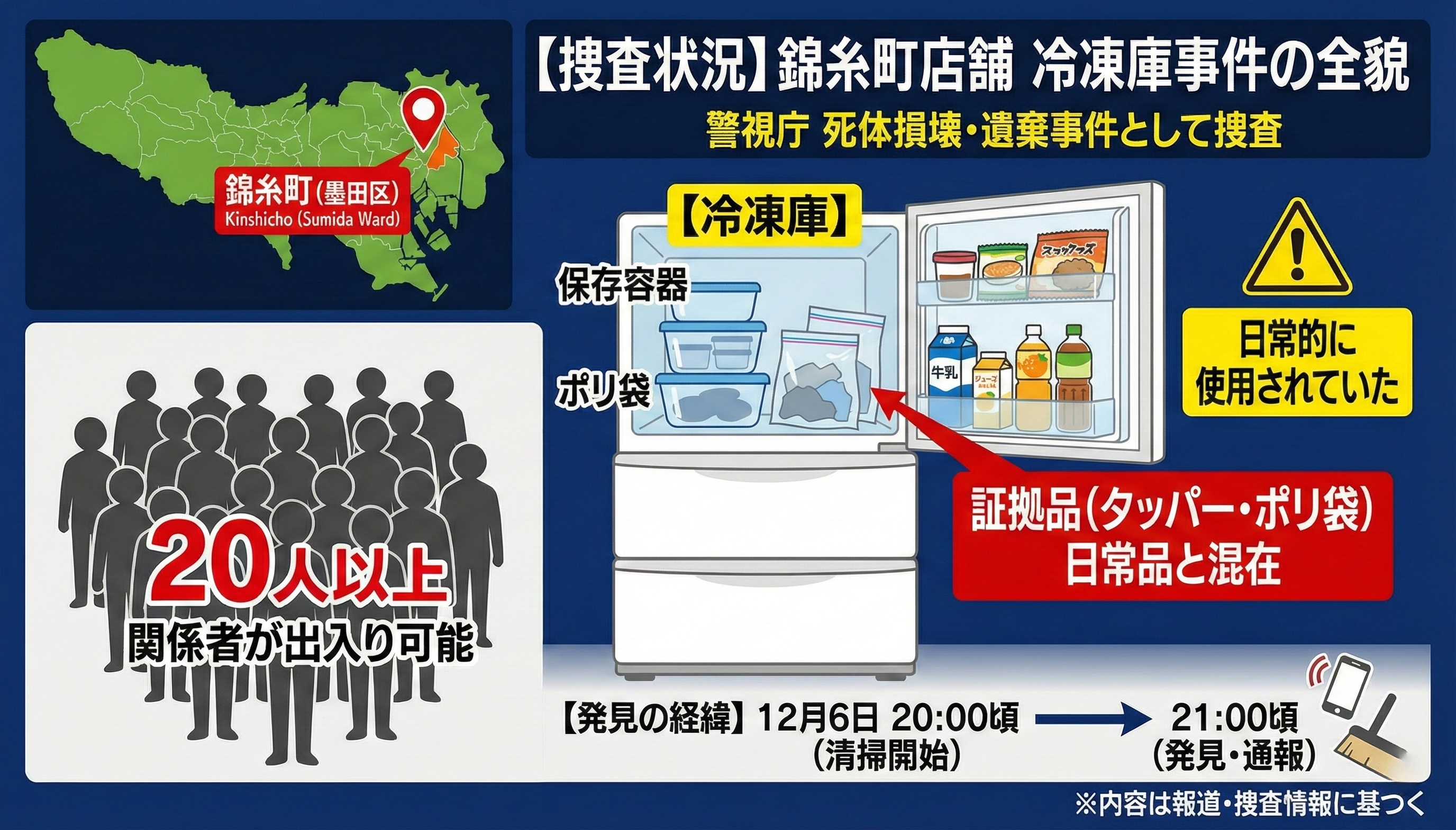 冷蔵庫内には、従業員らが飲むための飲料や食品なども保存されていました。日常的に開け閉めされる場所に遺体が隠されていたことになります。
