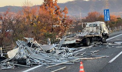 - 状況:トラックの単独事故とみられる荷崩れ。積載していた足場用の単管パイプが本線上に広範囲に散乱。