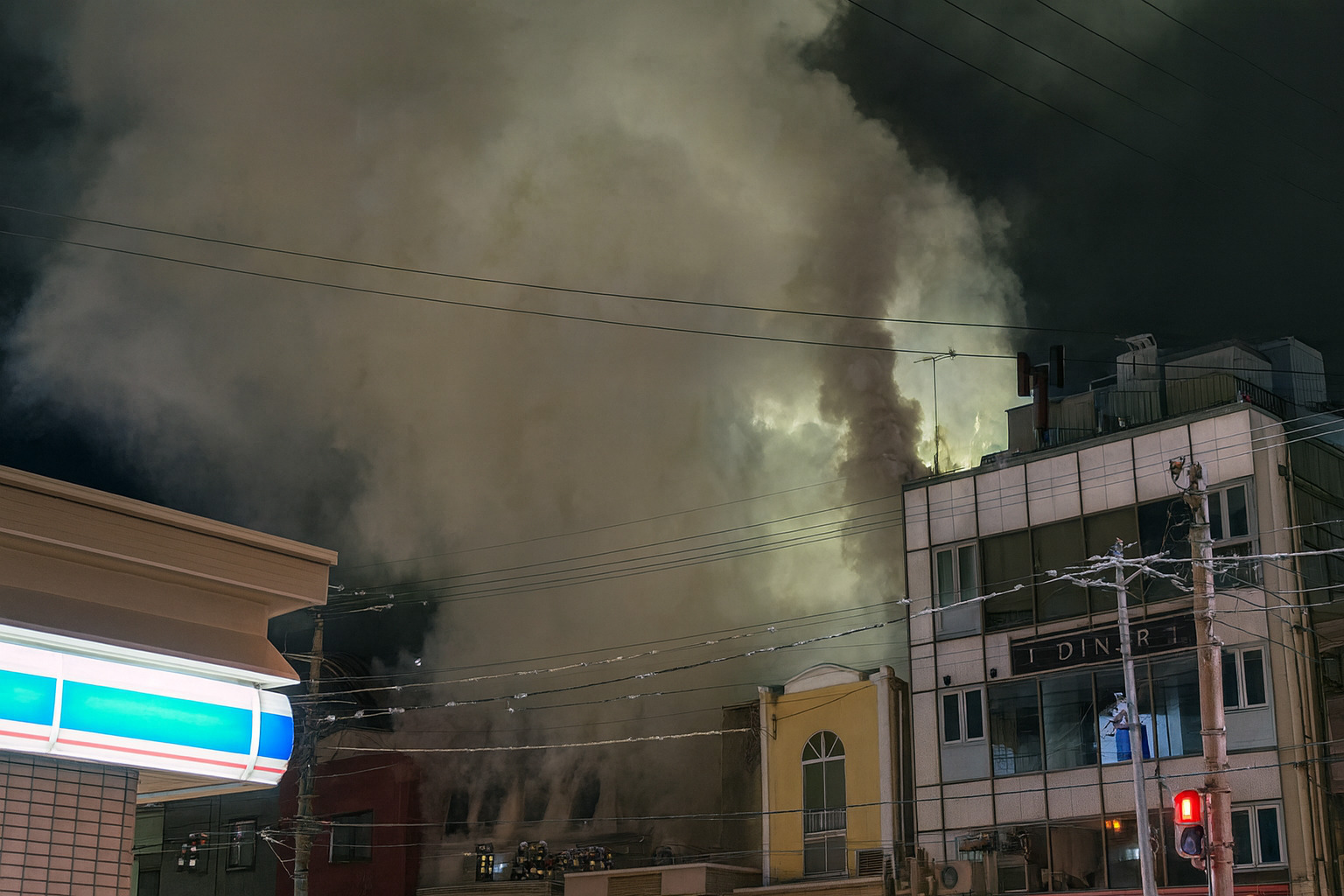 SNSに投稿された画像や動画からは、建物の屋上付近から大量の白煙や黒煙が立ち上り、夜空を覆っている様子が確認できます。