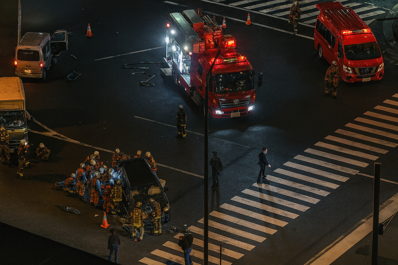 - 状況:トレーラーと乗用車の衝突。大きな衝突音が響き渡ったとの報告あり。