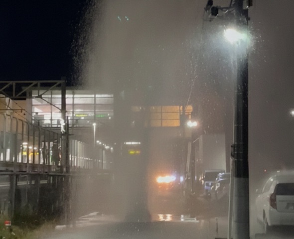 2025年12月12日夜、千葉県四街道市物井の物井駅前付近で、大規模な水道管の破裂が発生しました。ご投稿いただいた複数の画像や情報からは、マンホールや地面から水柱が激しく噴き上がっている様子が確認できます。