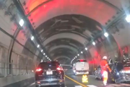 事故直後に現場を走行したドライバーからの情報によると、トンネル内では追越車線(右側)で複数台の車が停車しており、警察や道路公団による規制が行われています。