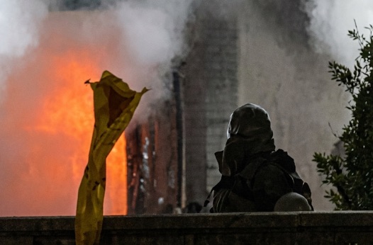 - 状況:建物から激しい炎と煙が上がっている