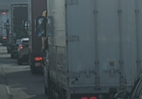投稿された画像からは、大型トラックが数珠つなぎになり、完全に停止またはノロノロ運転を強いられている様子が確認できます。日中の物流への影響も懸念されます。
