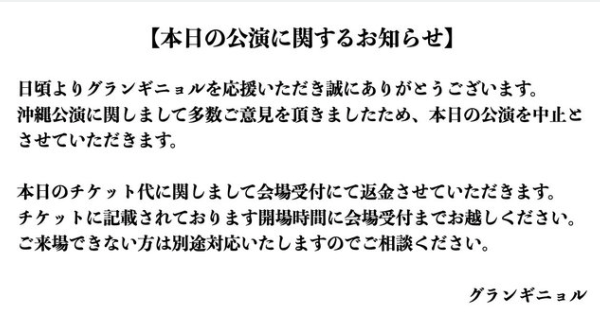 批判の声はヴィジュアル系ファンのみならず、一般層へも波及。 「センスがないというレベルではない」「遺族の気持ちを考えたことがあるのか」といった怒りの声が多く寄せられ、予定されていた沖縄公演についても中止等の影響が出ていました。