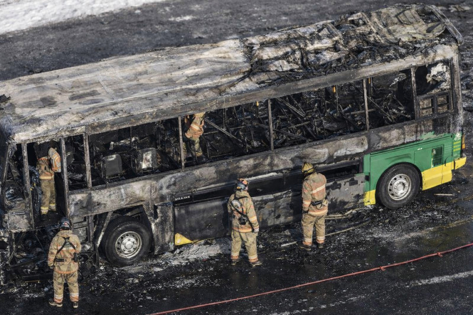 バス本体はほぼ全焼状態となっており、NHKのヘリ空撮映像や現場写真では車体が大きく焼け焦げ、フレームのみが残るほどの激しい損傷が確認されています。