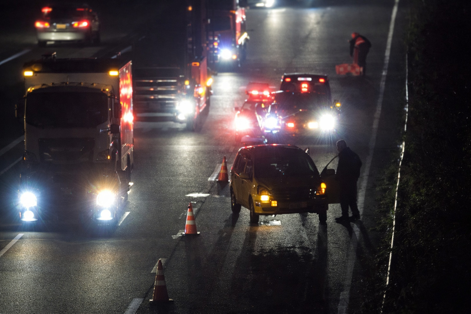 投稿された画像からは、赤色灯を回した警察車両や道路パトロールカーが複数台到着し、走行車線を塞いで処理にあたっている様子が確認できます。現場は騒然としており、破片の散乱など路面状況も悪化しているため、通過の際はパンク等にも注意が必要です。