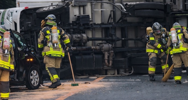 - 状況:トラックの横転事故、乗用車との接触等の可能性あり